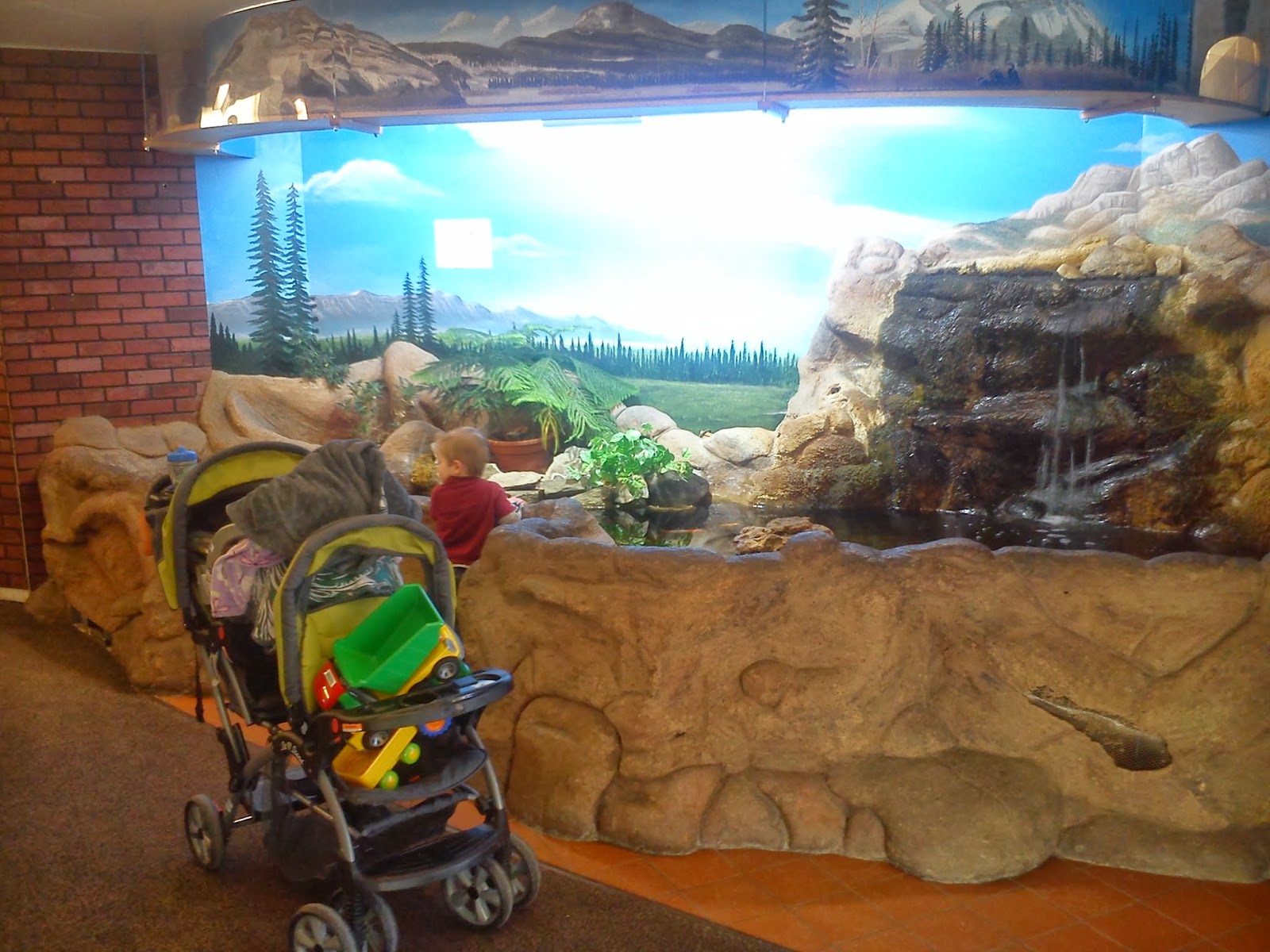 The weather has been quite nice the last little while. So thankful for no big snowstorms...although in Ontario it seems to be the norm...*thinking of you guys! We've had blue skies and aside from some crazy wind, it's been great. I decided to take advantage of it and took the kids to Lethbridge and we stopped in at the library and they've got a big fish pond at the entrance and an electric train driving around. It's really neat for kids and James was just mesmerized. He quickly learned where the button was to get the train going again and it took more than bribing him with candy to get him out of there. There is a toy library there as well so one can pick any toy they want and take it home and return in three weeks. Ideal for getting new toys in the house without the cost associated (and the clutter). Hereby some pics for those visual people out there...